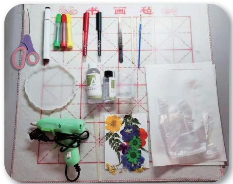 准备材料:AB胶、热熔胶及胶枪、书画毡、水粉笔、水彩笔、马克笔、勾线笔、干花、波浪杯垫模具、量杯、搅拌棒、手套、口罩、宣纸、PVC板、镊子、安全剪刀(以上材料均可网购获得)。