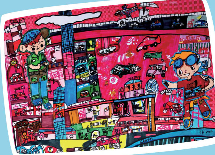 昱熹的这幅画创意独特,极具视觉冲击力。画面以明亮、跳跃的色彩,纵横交错的线条,构建出一个奇幻的游戏世界。城市变作游戏地图,各种交通工具成为游戏道具。(剩余336字)