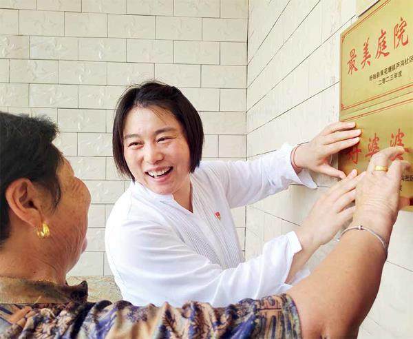 徐玲(右)为社区居民颁发“最美庭院”和“好婆婆”奖。