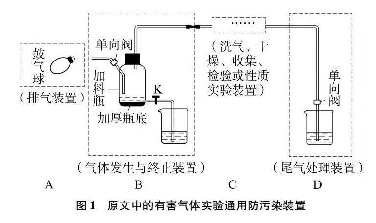 本刊2022年第10期“有害气体实验通用防污染装置的设计”一文[1](下称“原文”),提出了用“釜底抽薪”的方法从气体发生装置中排出液体,通过固液分离、冷却、稀释、中和等方法来终止反应,用鼓气球排出装置内残留有害气体的设计方案(见图1所示)。(剩余3548字)