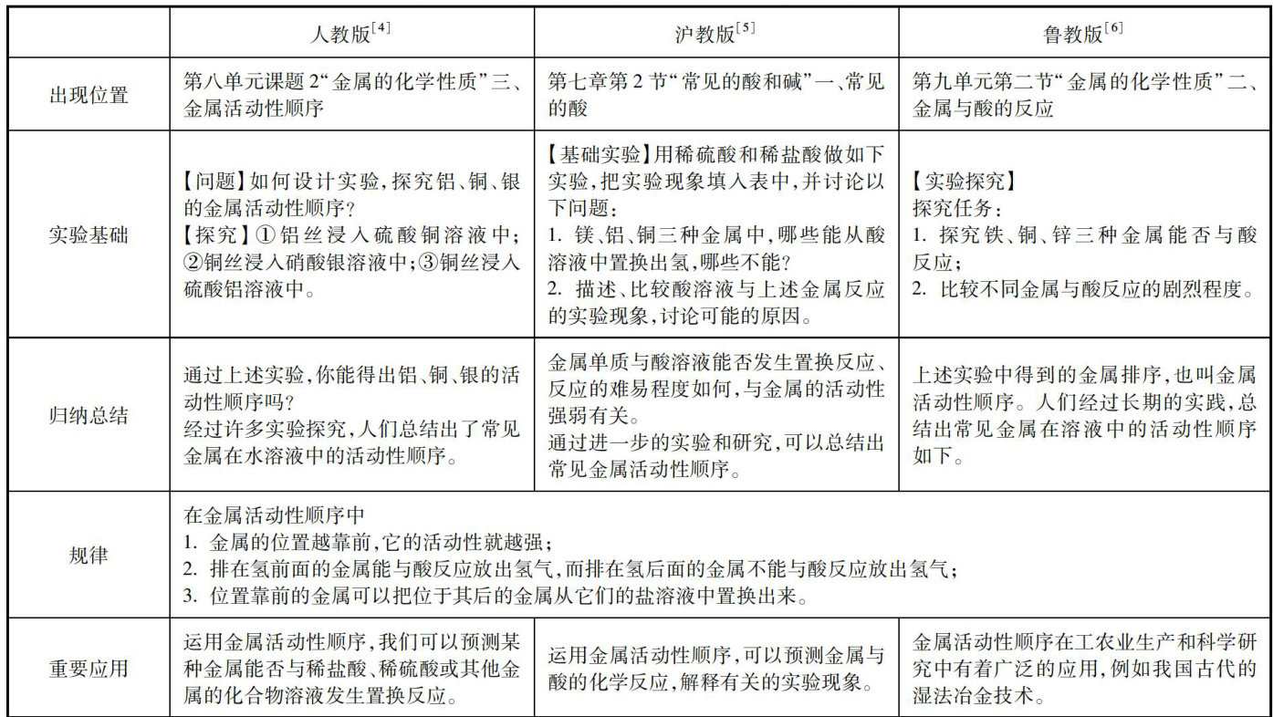 金属活动性顺序是中学阶段一个重要的规律,贯穿中学化学的教学过程,其不仅指导着金属置换反应的判断,而且在电化学中也有着广泛的应用。课程标准分别在内容与学业水平部分明确要求“通过实验探究等活动认识常见金属的主要化学性质及金属活动性顺序”1],“能运用研究物质性质的一般思路与方法,从物质分类的视角,依据金属活动性顺序初步预测常见的金属的主要性质,设计实验方案,分析、解释有关的实验现象,进行证据推理,得出合理的结论”[2]。(剩余4325字)