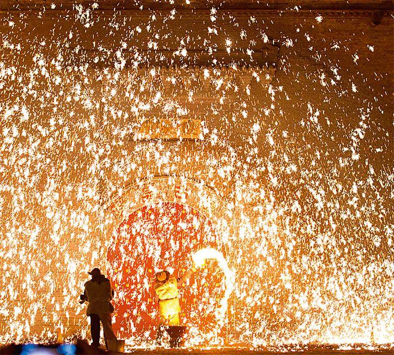 Iron Fireworks, a kind of spectacular traditional Chinese folk art dating back to the Northern Song Dynasty, was initially used by blacksmiths to celebrate harvests and pray for safety. It requires great courage and skill: craftsmen smelt iron to over 1,600℃, scoop up the molten iron with wet wooden spoons, and hurl it at cold iron plates—sending up golden iron sparks as high as 10 meters. As a folk art passed down from master to apprentice, it symbolizes vitality, good fortune, and perseverance. It is a festive highlight in regions like Henan and Shanxi provinces, reminding people to cherish the wisdom of ancient craftsmen and the beauty of handcrafted creations.