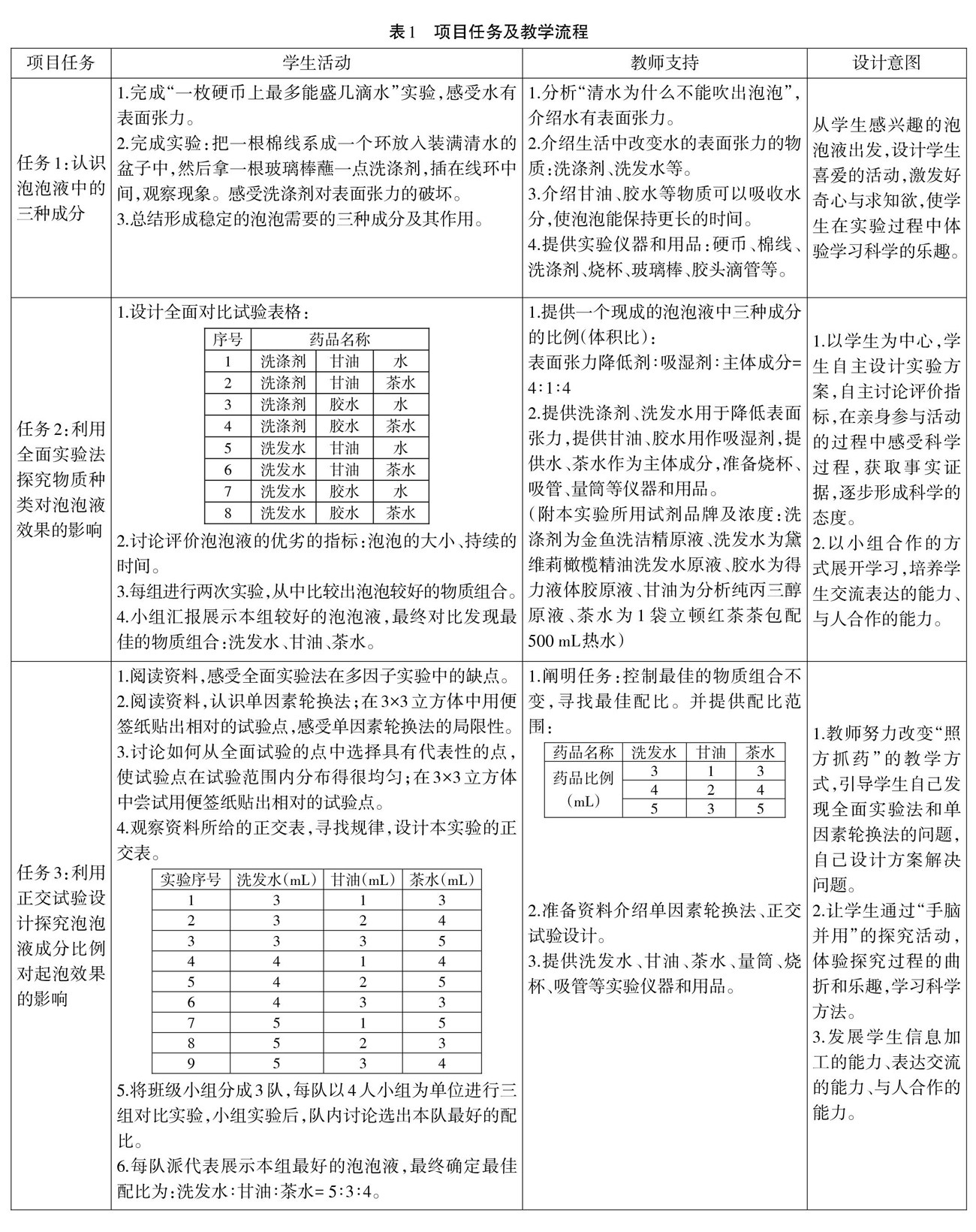 摘要:以“自制泡泡液”为主题开展初中科学探究的教学活动;学生通过完成认识泡泡液中的三种成分、利用全面实验法探究物质种类对泡泡效果的影响和利用正交试验设计探究泡泡液成分比例对起泡效果的影响三个项目任务,认识了科学探究的过程要素:提出问题、猜想假设、设计实验、进行实验、检验评价、表达交流,学习了全面实验法、单因素轮换法、正交试验设计等科学实验设计方法,体验了科学研究的严谨性和有用性,发展了科学探究的素养,培养了创新精神和实践能力。(剩余3858字)