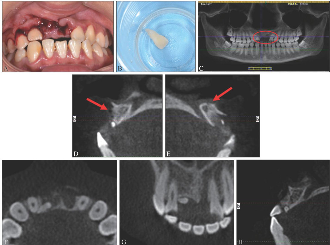 上颌中切牙完全脱位后异位牙再植及延期种植修复1例
