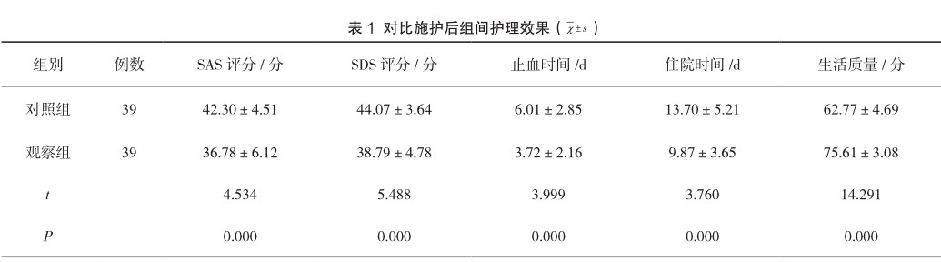 【摘要】目的:探讨在胃溃疡大出血老年患者治疗中强化心理护理,对提升临床疗效及降低并发症发生的施护价值。方法:试验对象选择于2020年1月—2022年2月期间,在我院就医的胃溃疡大出血老年患者78例,以随机数字表法均分为两组,在施治期间提供常规护理与强化心理护理,统计组间心理状况、止血时间、住院时间、满意度及并发症差异性。(剩余5697字)
