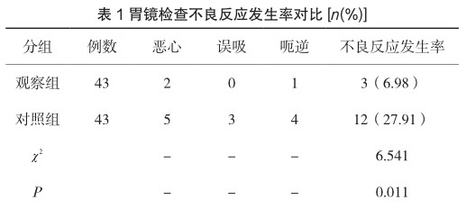 【摘要】目的:研究饮食护理和优质护理的联合应用及效果。方法 2020年8月—2021年12月期间收治无痛胃镜检查患者为研究对象,共86例,分组后两组均43例。对照组常规护理,用饮食护理联合优质护理对观察组患者进行干预,对比两组护理结果,分析护理效果。结果:无论是心率、血压等体征表现,还是胃镜检查的不良反应,观察组的干预效果均更理想(P