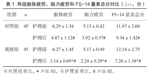 【摘要】目的:探讨自我管理模式在慢性肾脏病患者护理中的应用价值。方法:选取2018年11月—2021年11月我院的90例慢性肾脏病患者,随机分成两组。对照组采取常规护理,观察组采取自我管理模式。比较两组的护理效果。结果:护理前,两组的躯体疲劳、脑力疲劳和FS-14量表总分无明显差异(P>0.05),护理后,两组的躯体疲劳、脑力疲劳和FS-14量表总分均明显降低(P0.05),护理后,两组的合理用药、运动锻炼、自我监测、情绪控制和合理饮食评分均明显升高(P