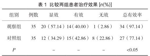 【摘要】目的:探究糖皮质激素吸入治疗支气管哮喘的效果。方法:将2020年1月—2022年1月入院的70例患者作为此次研究对象,并根据随机法分为对照组和观察组,各35例。对照组采用常规疗法治疗,观察组采用糖皮质激素吸入治疗。对两组最终的治疗效果进行比较分析。结果:观察组的治疗效果比较对照组,明显更高(P0.05);治疗后,上述指标观察组患者比较对照组明显更高(P