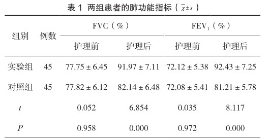 【摘要】目的:探讨胸部外伤肋骨骨折护理对肺功能的影响。方法:从本院于2021年1月—2022年1月间收治的胸部外伤肋骨骨折患者中,收集90例患者为本次研究对象,采用随机数字表法分为实验组和对照组两组,每组45例,对照组采用常规护理,实验组采用个体化护理。结果:在肺功能指标方面,护理前,两组患者FVC、FEV1数据差异不明显,无统计学意义(P>0.05);护理后,实验组FVC、FEV1均高于对照组(P0.05);护理后,实验组SDS评分、SAS评分均低于对照组(P