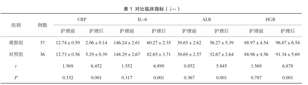 【摘要】目的:观察肝硬化患者采取全程优质护理的应用价值。方法:本文选取2020年1月—2021年12月本院收治的73例肝硬化患者作为研究对象,对照组行常规护理,观察组行全程优质护理。结果:观察组观察组CRP、IL-6低于对照组,ALB、HGB高于对照组,住院时间、肝硬化症状积分低于对照组,疾病掌握程度、满意度高于对照组,并发症低于对照组,差异有统计学意义(P
