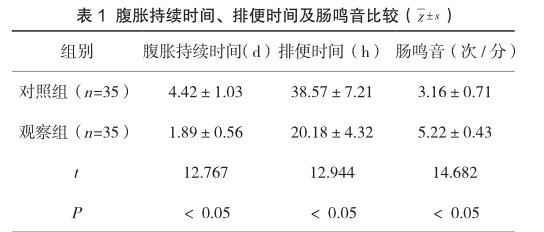【Abstract】Objective: To analyze and evaluate the effect of intensive nursing on the symptoms of patients with severe abdominal distension during perioperative period. Methods: A total of 70 patients with abdominal distension caused by orthopedic trauma during perioperative period were selected and analyzed. They were divided into two groups. 35 patients in the control group were given routine nursing intervention; The observation group (35 cases) received intensive nursing intervention; To observe and evaluate the effect of two nursing methods on the symptoms of patients with severe abdominal distension during perioperative period. Results: The duration of abdominal distension and defecation time in the observation group were significantly shorter than those in the control group, and the bowel sounds in the observation group were significantly better than those in the control group(P