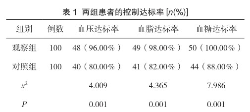 【摘要】目的:探讨早期足部护理干预在预防糖尿病足患者中的临床应用效果观察分析。方法:选取我科200例2型糖尿病患者为对象,每组100例,分别是观察组、对照组,前者实施早期足部护理干预护理(制定管理方案、用药教育、早期足部干预等),后者实施常规护理。结果:观察组的血压、血脂、血糖达标率大于对照组,有统计学意义(P