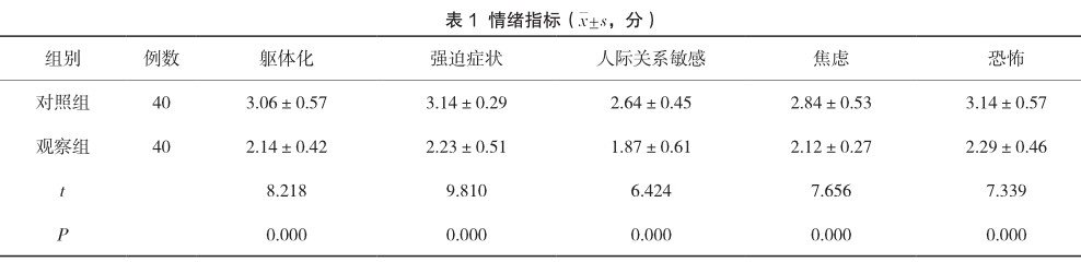【摘要】目的:探讨在整形美容治疗中辅以语言沟通,对护理效果的影响。方法:纳入对象为2022年1月—2023年3月在医院接受整形美容的80例患者,以随机信封法均分成对照组与观察组,对照组采用常规护理,观察组加用语言沟通,比对两组情绪、满意度与依从性。结果:观察组情绪评分低于对照组(P