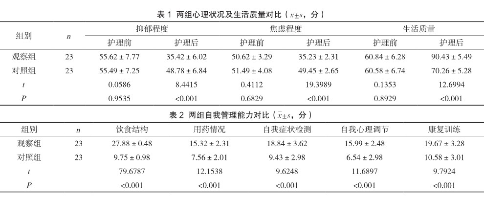 【摘要】目的:探究中青年脑梗死患者康复中采用早期心理指导的作用。方法:选取2021年1月—2022年12月期间在我院接受治疗的46例中青年脑梗死患者,随机分为观察组及对照组,各23例,观察组采用早期心理指导,对照组采用常规护理,对比护理效果。结果:观察组护理后抑郁程度、焦虑程度、生活质量分别(35.42±6.02)分、(35.23±2.31)分、(90.43±5.49)分,优于对照组(P