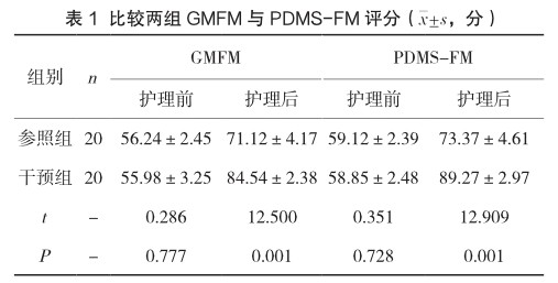 【摘要】目的:浅析脑瘫患儿开展综合性康复护理干预的实际效果。方法:将40例脑瘫患儿作为本次研究对象,按照电脑盲选法将其分为参照组(采用常规护理)与干预组(采用综合性康复护理),每组20例,所有患儿均于2021年1月—2023年2月收入我院,对比两组护理效果。结果:护理后,干预组粗大运动功能测试量表(GMFM)与精细运动发育量表(PDMS-FM)评分高于参照组,P