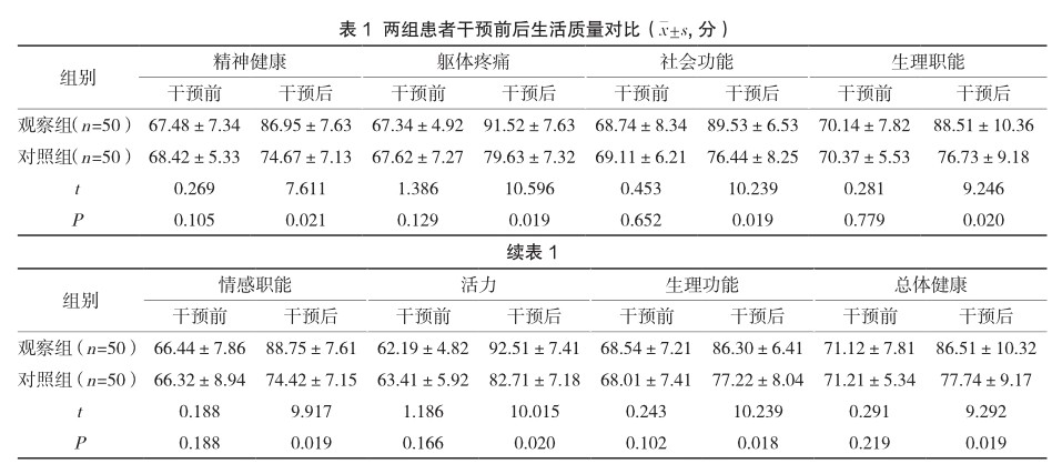 【Abstract】Objective:To explore the effect of nursing intervention measures on the quality of life of patients with reflux esophagitis. Methods:One hundred patients with reflux esophagitis admitted to our hospital were selected and analyzed.They were divided into two groups according to the nursing plan,and the nursing effects of the two groups were compared.Results:After intervention,the quality of life,compliance and nursing quality in the observation group were better than those in the control group,P