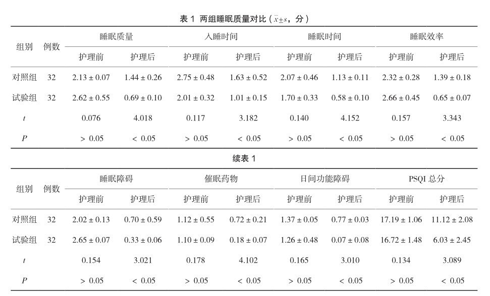【摘要】目的:探析优质护理应用于冠心病护理中的效果及对患者睡眠质量的影响。方法:将2020年12月—2021年12月到我院诊疗的64例冠心病患者纳入调研,按照奇偶法分为对照组和试验组,各32例,护理方案分别为传统护理与优质护理;然后将调研所得数据予以有效评估,最终分析其应用表现。结果:护理后,试验组睡眠质量评分低于对照组(P