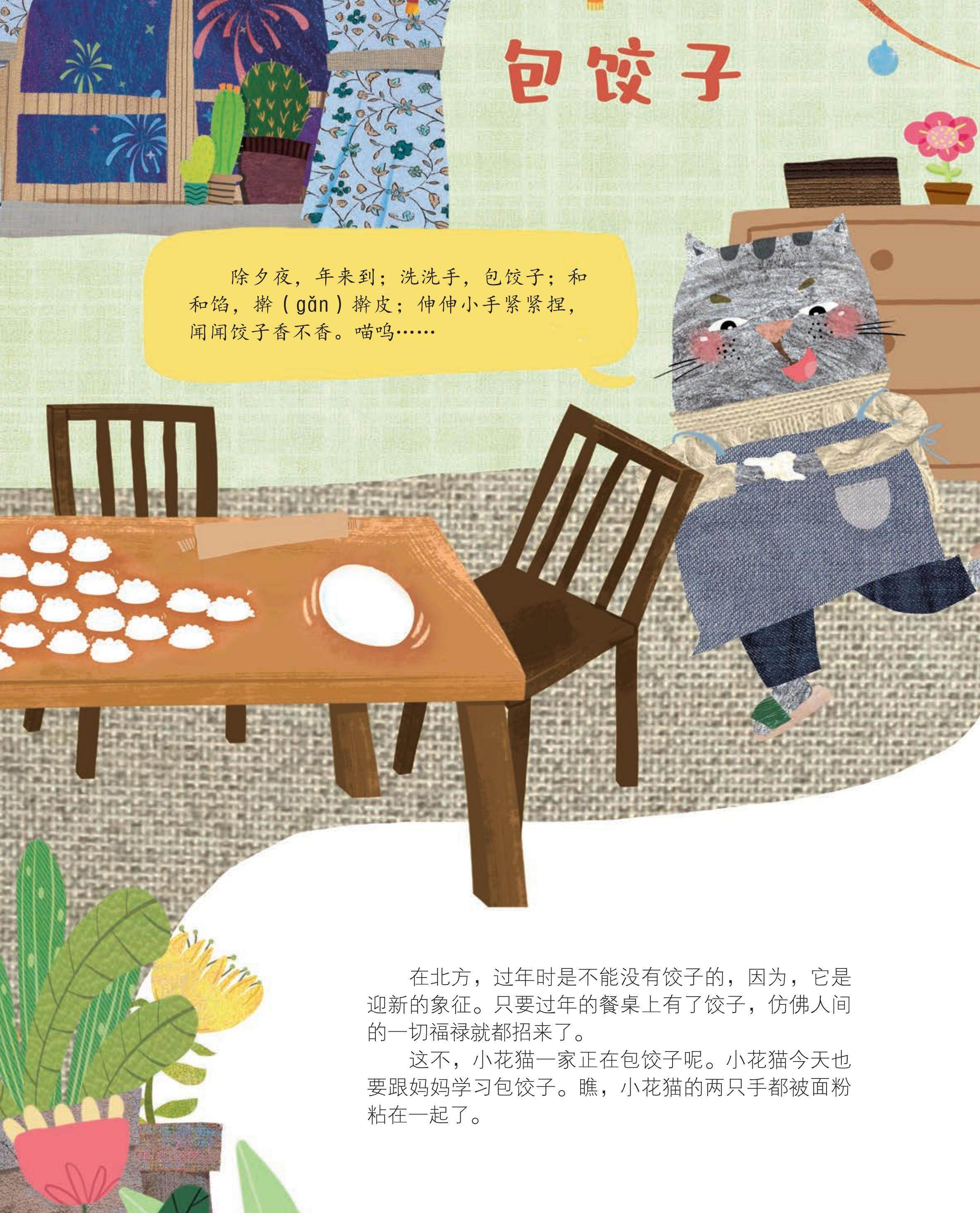 除夕夜,年来到;洗洗手,包饺子;和和馅,擀(gǎn)擀皮;伸伸小手紧紧捏,闻闻饺子香不香。喵呜……