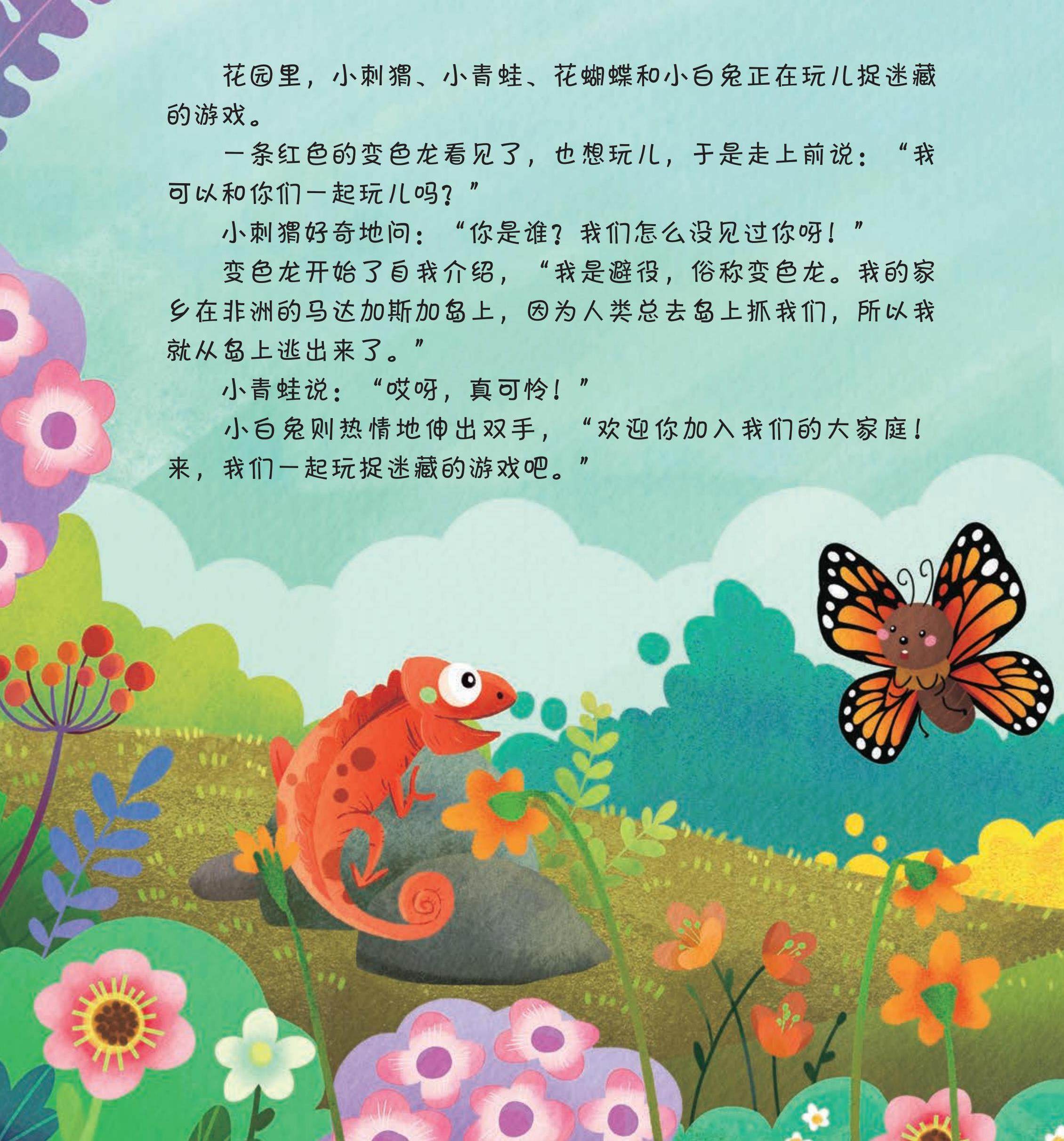 花园里,小刺猬、小青蛙、花蝴蝶和小白兔正在玩儿捉迷藏的游戏。