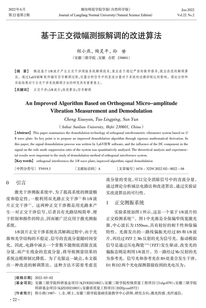 【摘 要】 概述基于1/8波片产生正交干涉测振系统解调技术,重点在于通过严密的数学推导,提出改进的解调算法。通过LabVIEW软件编写信号解调过程,定量分析信号中的直流分量对于系统的边模抑制比的影响。理论分析和实验结果对于正交干涉系统解调方法的研究具有重要意义。(剩余3243字)