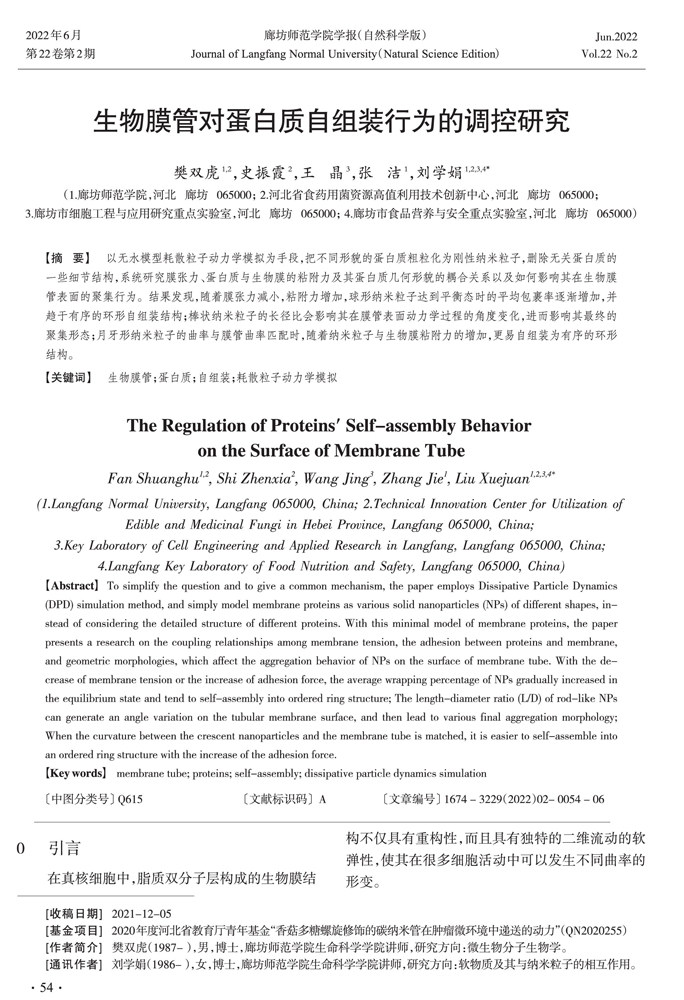 【摘 要】 以无水模型耗散粒子动力学模拟为手段,把不同形貌的蛋白质粗粒化为刚性纳米粒子,删除无关蛋白质的一些细节结构,系统研究膜张力、蛋白质与生物膜的粘附力及其蛋白质几何形貌的耦合关系以及如何影响其在生物膜管表面的聚集行为。结果发现,随着膜张力减小,粘附力增加,球形纳米粒子达到平衡态时的平均包裹率逐渐增加,并趋于有序的环形自组装结构;棒状纳米粒子的长径比会影响其在膜管表面动力学过程的角度变化,进而影响其最终的聚集形态;月牙形纳米粒子的曲率与膜管曲率匹配时,随着纳米粒子与生物膜粘附力的增加,更易自组装为有序的环形结构。(剩余7558字)