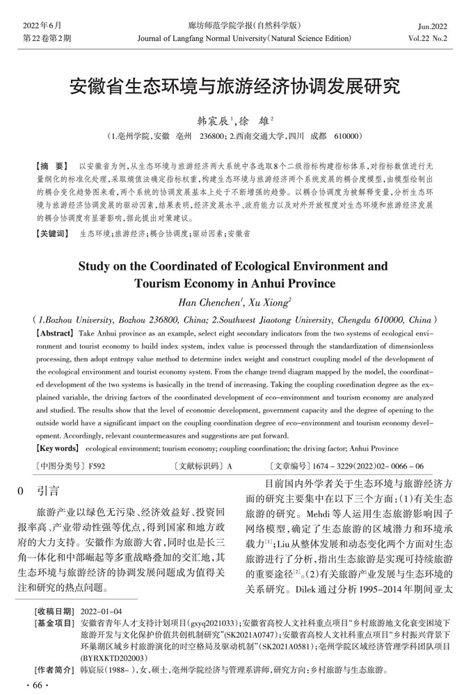 【摘 要】 以安徽省为例,从生态环境与旅游经济两大系统中各选取8个二级指标构建指标体系,对指标数值进行无量纲化的标准化处理,采取熵值法确定指标权重,构建生态环境与旅游经济两个系统发展的耦合度模型,由模型绘制出的耦合变化趋势图来看,两个系统的协调发展基本上处于不断增强的趋势。(剩余6674字)