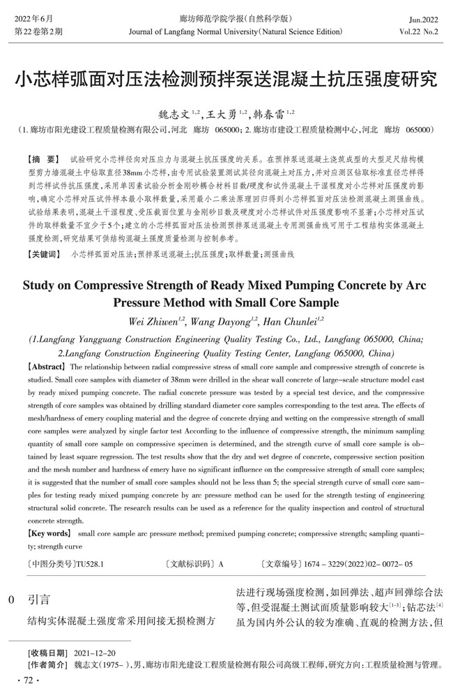 小芯样弧面对压法检测预拌泵送混凝土抗压强度研究