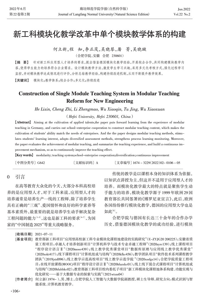 【摘 要】 针对新工科应用型人才培养的要求,提出借鉴德国模块化教学经验,开展校企合作,共同构建模块教学内容,使得学生能力的培养符合企业需求。设计模块教学方法,激发学生学习兴趣,采用多元化考核方式,强化过程学习监控,并对模块教学达成情况进行评价,分析总结教学经验,构建持续改进机制,从而不断提升教学效果。(剩余6667字)