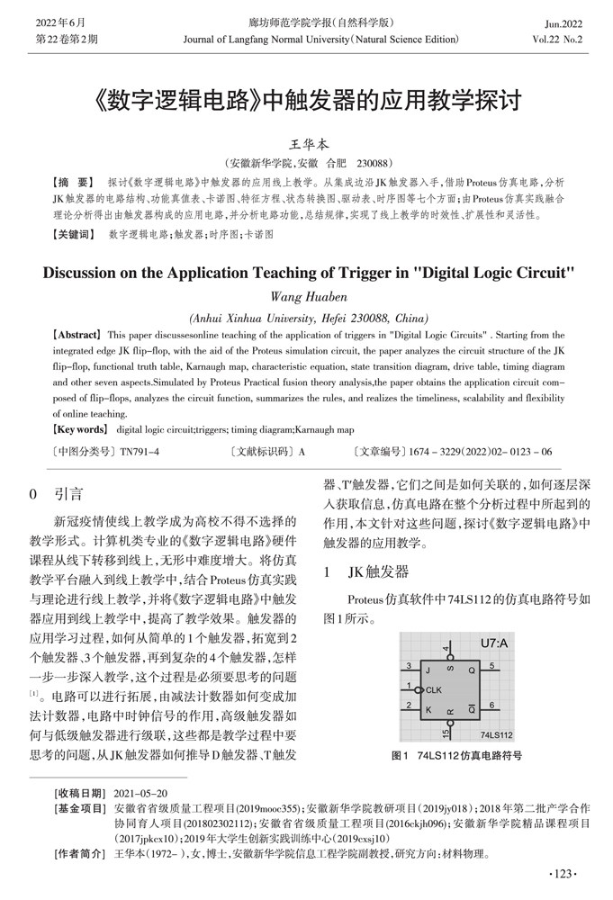 【摘 要】 探讨《数字逻辑电路》中触发器的应用线上教学。从集成边沿JK触发器入手,借助Proteus仿真电路,分析JK触发器的电路结构、功能真值表、卡诺图、特征方程、状态转换图、驱动表、时序图等七个方面;由Proteus仿真实践融合理论分析得出由触发器构成的应用电路,并分析电路功能,总结规律,实现了线上教学的时效性、扩展性和灵活性。(剩余6346字)