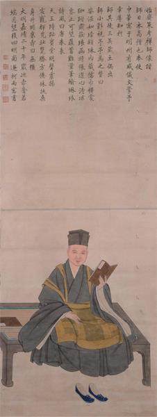 在日本京都五山之一的天龙寺妙智院,藏有一幅与明代中日交往密切相关的画像——《策彦禅师像》。画面上一位僧人身着短幅袈裟,头戴东坡巾,布鞋置于前方,坐在藤编的榻上,该画像绘制的正是日本室町时代(1336—1573)的遣明使策彦周良。