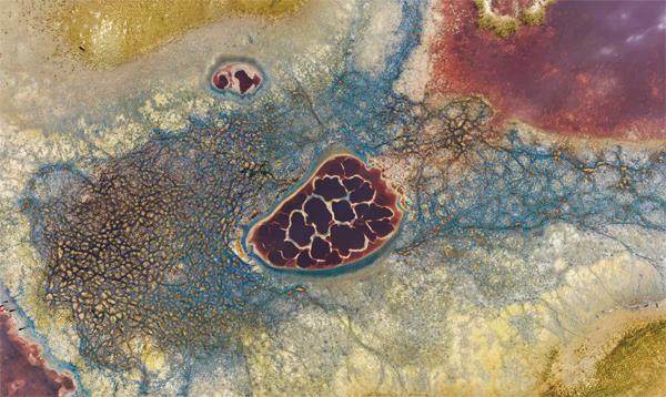 2025年10月6日,内蒙古阿拉善,航拍“地球之心”乌兰湖。乌兰湖位于内蒙古阿拉善左旗腾格里沙漠腹地,红色的湖面、白色的盐藻、黄色的沙漠等交相辉映。