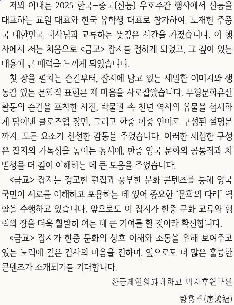 我和我的爱人有幸作为山东的教师代表和韩国留学生代表,参加了2025中国(山东)一韩国友好周活动,并与驻华大使卢载宪先生进行了交流。在此活动中,我初次结识了《金桥》杂志,并深深地被其内容吸引。