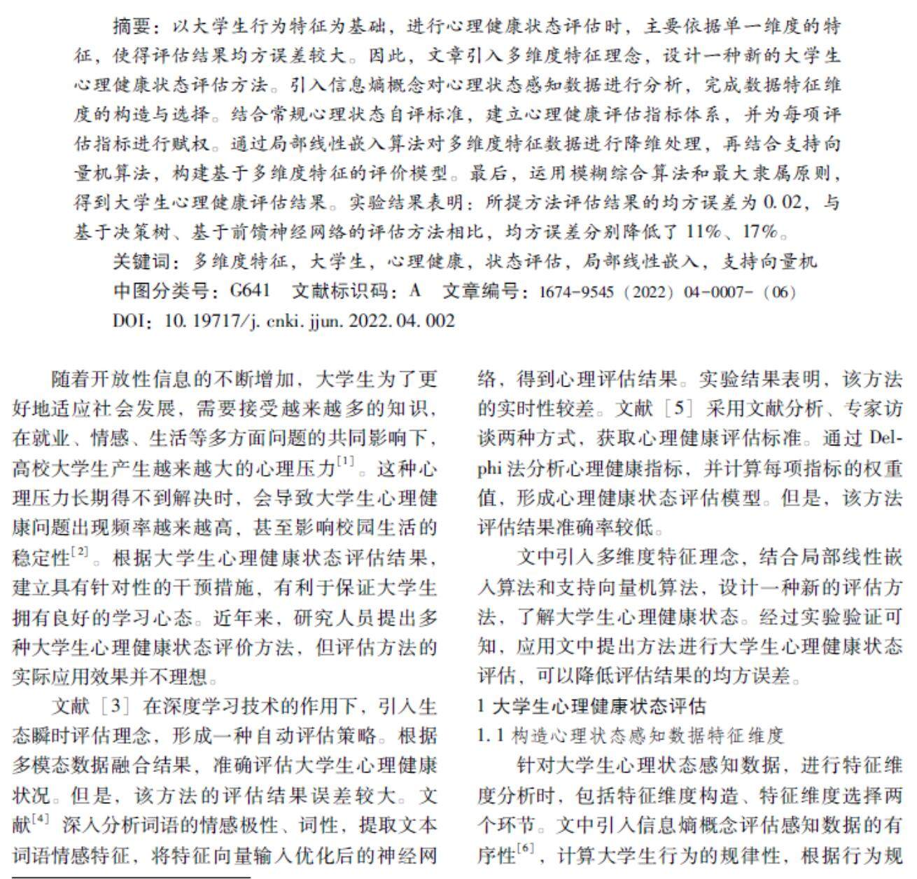 摘要:以大学生行为特征为基础,进行心理健康状态评估时,主要依据单一维度的特征,使得评估结果均方误差较大。因此,文章引入多维度特征理念,设计一种新的大学生心理健康状态评估方法。引入信息熵概念对心理状态感知数据进行分析,完成数据特征维度的构造与选择。结合常规心理状态自评标准,建立心理健康评估指标体系,并为每项评估指标进行赋权。(剩余8396字)
