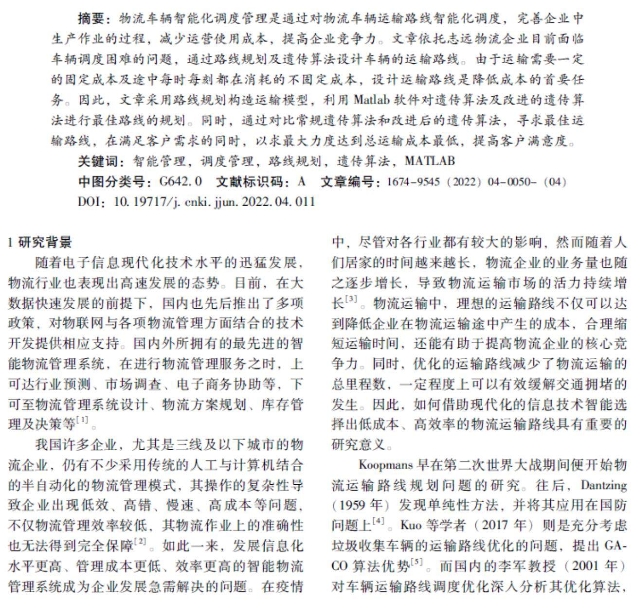 摘要:物流车辆智能化调度管理是通过对物流车辆运输路线智能化调度,完善企业中生产作业的过程,减少运营使用成本,提高企业竞争力。文章依托志远物流企业目前面临车辆调度困难的问题,通过路线规划及遗传算法设计车辆的运输路线。由于运输需要一定的固定成本及途中每时每刻都在消耗的不固定成本,设计运输路线是降低成本的首要任务。(剩余4397字)