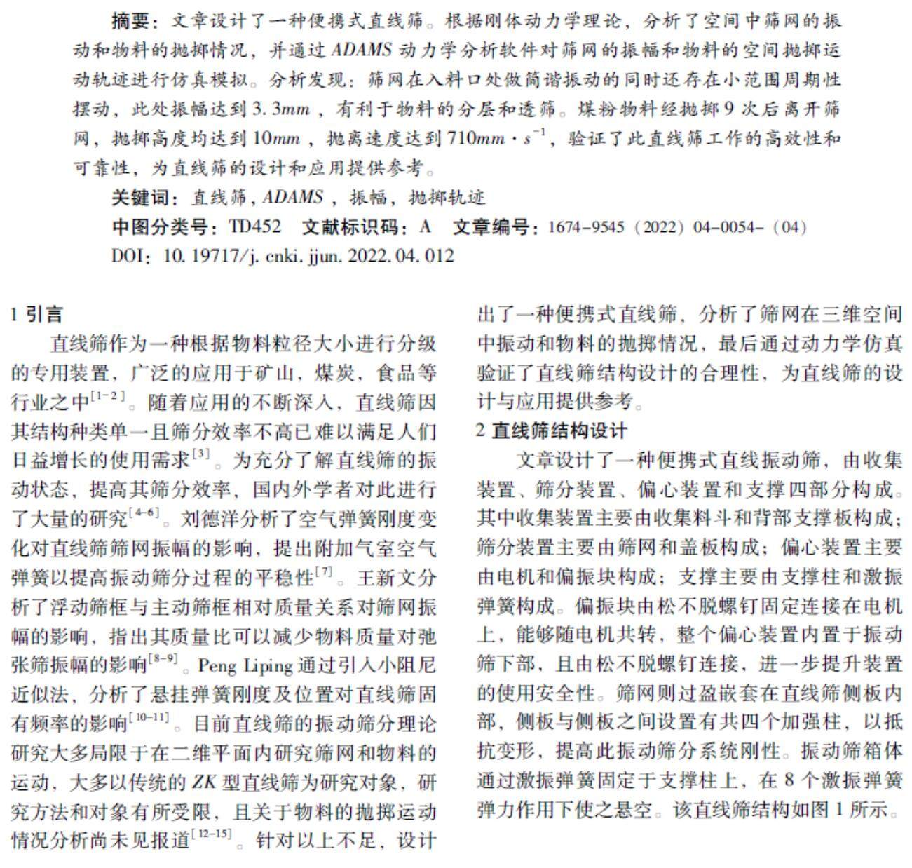 摘要:文章设计了一种便携式直线筛。根据刚体动力学理论,分析了空间中筛网的振动和物料的抛掷情况,并通过ADAMS动力学分析软件对筛网的振幅和物料的空间抛掷运动轨迹进行仿真模拟。分析发现:筛网在入料口处做简谐振动的同时还存在小范围周期性摆动,此处振幅达到3.3mm,有利于物料的分层和透筛。煤粉物料经抛掷9次后离开筛网,抛掷高度均达到10mm,抛离速度达到710mm·s-1,验证了此直线筛工作的高效性和可靠性,为直线筛的设计和应用提供参考。(剩余6688字)