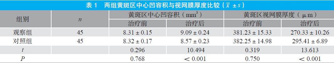 结果 治疗后观察组黄斑区中心凹容积大于对照组,视网膜厚度低于对照组(P<0.05);治疗前,两组视力比较,差异无统计学意义(P>0.05);治疗后观察组视力水平高于对照组(P<0.05);治疗前,两组生活质量评分比较,差异无统计学意义(P>0.05);治疗后观察组生活质量评分高于对照组(P<0.05);观察组治疗总有效率高于对照组(P<0.05);观察组并发症发生率低于对照组(P<0.05)。(剩余3654字)