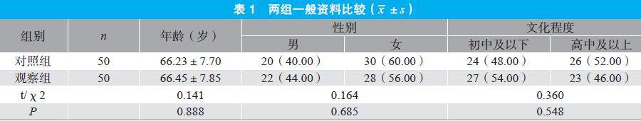 方法 根据随机数字表法,将2024年1月至2025年1月医院收治的100例高血压患者分为两组,其中50例