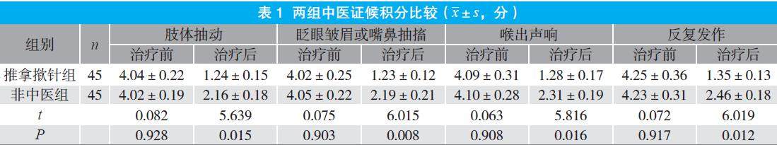 摘要:目的 探讨小儿推拿结合揿针治疗脾虚肝旺型小儿抽动症的临床有效性。方法 选取2022年5月至2024年12月医院收治的90例脾虚肝旺型抽动症患儿为研究对象,经随机数字抽样法分为非中医组和推拿揿针组各45例。非中医组采用西药治疗(盐酸硫必利片),在此基础上推拿揿针组增加小儿推拿结合揿针治疗,比较两组患儿中医证候改善情况、西医临床疗效及不良反应发生情况。(剩余4005字)
