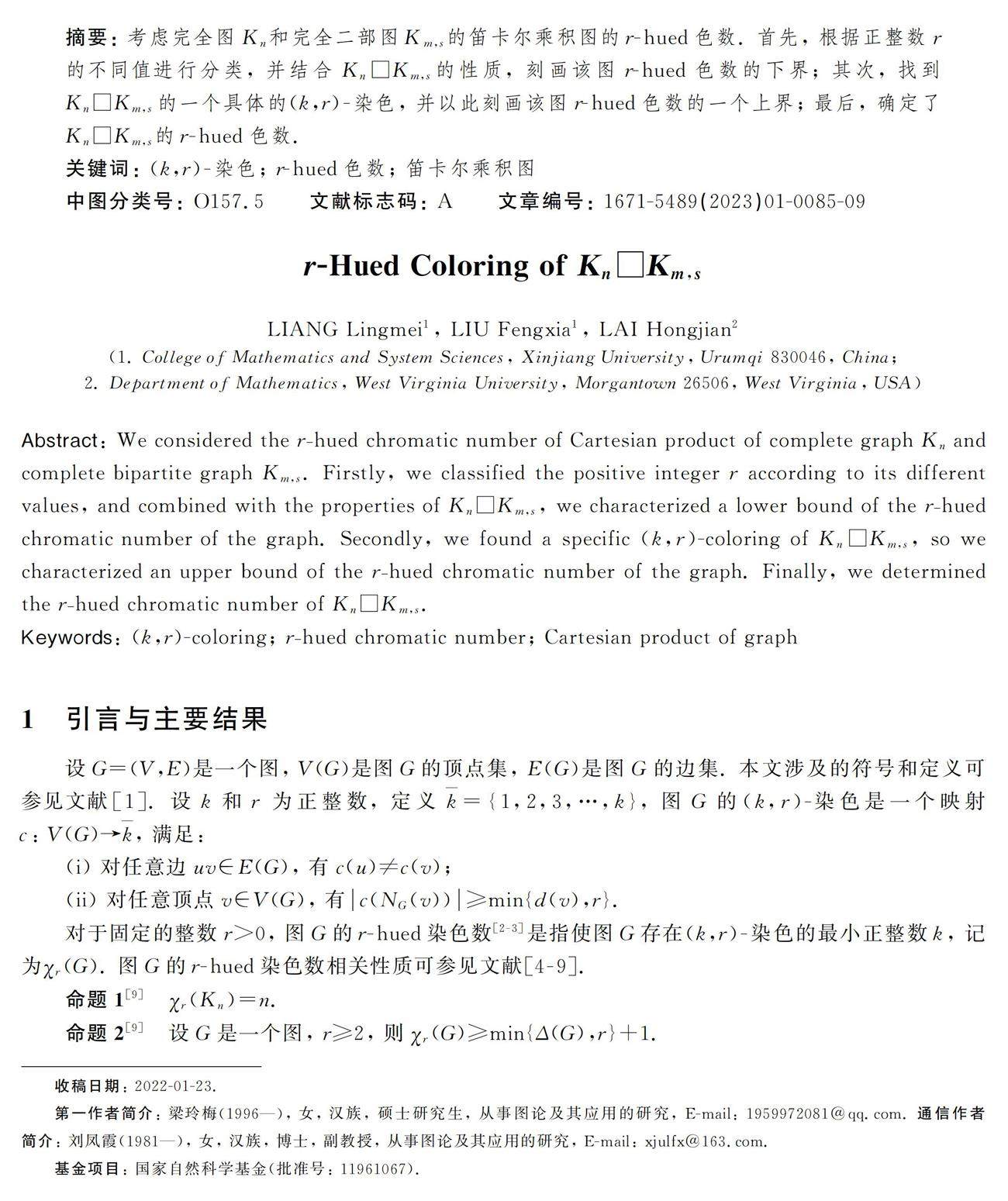 的性质,刻画该图r-hued色数的下界; 其次,找到Kn□Km,s的一个具体的(k,r)-染色,并以此刻画该图r-hued色数的一个上界; 最后,确定了Kn□(剩余2845字)