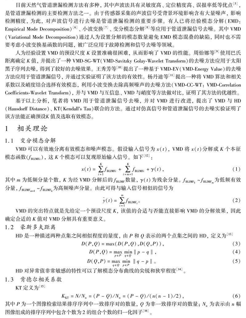摘要: 针对变分模态分解(VMD: Variational Mode Decomposition)难以选取预设尺度K 和其分解后难以区分有效模态和噪声模态的问题, 提出了一种由豪斯多夫距离(HD: Hausdorff Distance)确定K 和肯德尔相关系数(KT:Kendall 蒺s Tau)确定有效模态的联合准则方法(VMD鄄HD鄄KT), 并将其应用于天然气管道泄漏信号去噪。(剩余493字)