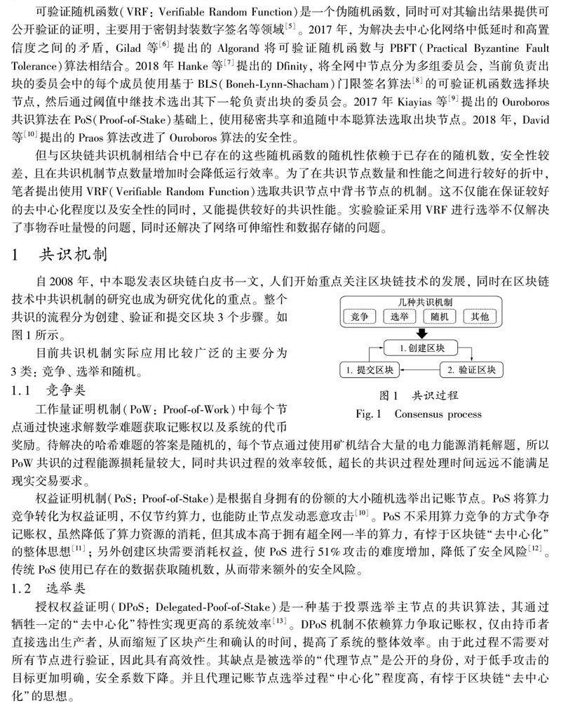 摘要: 传统共识机制中所有背书节点参与背书, 时间消耗量大, 并且存在伪造及操控共识过程的可能性问题,安全性较低。为此, 基于可验证随机函数在背书节点候选集中随机抽取背书节点进行背书操作, 其他背书节点等候其他交易执行时被随机选举, 这种随机方式使背书的过程可以并行化, 能有效提升处理效率, 减少共识机制的处理时间。(剩余628字)