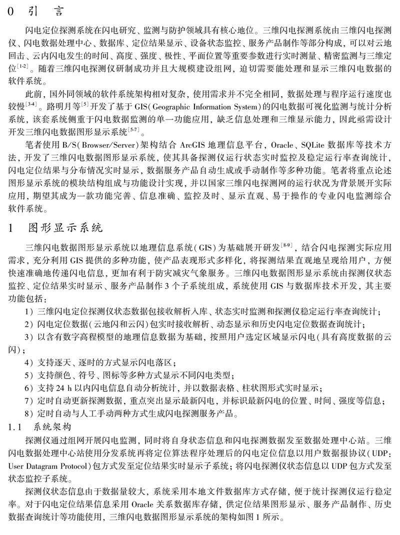 摘要: 针对三维闪电探测仪大规模组网后, 接收和解算的定位数据大幅增加, 国内缺少专用于三维闪电数据监测显示与处理制作方面的软件, 使用B/ S(Browser/ Server)架构结合ArcGIS 地理信息平台, Oracle、SQLite数据库等技术方法, 开发了三维闪电数据图形显示系统。利用状态数据接收与解析入库、探测仪实时状态统计等功能模块设计出状态监控子系统; 利用定位数据实时统计、历史查询、三维显示等功能模块设计出实时显示子系统, 联合具有数据服务产品生成功能的产品制作子系统组成图形显示系统, 以国家三维闪电探测网为实际应用背景验证系统功能和运行状况。(剩余112字)