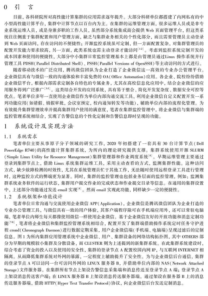 摘要: 为解决高性能集群监控管理中, 系统异常监测受时间、地点限制, 集群管理员无法及时发现集群异常从而影响集群系统正常运行等问题, 利用企业微信的开放功能和消息传送机制, 结合Linux(GNU/ Linux)操作系统集群监控管理方法, 开发了适合中小型集群的简单易用, 并极易扩展的集群监控管理系统, 实现了手机端预警信息呈现功能。(剩余288字)