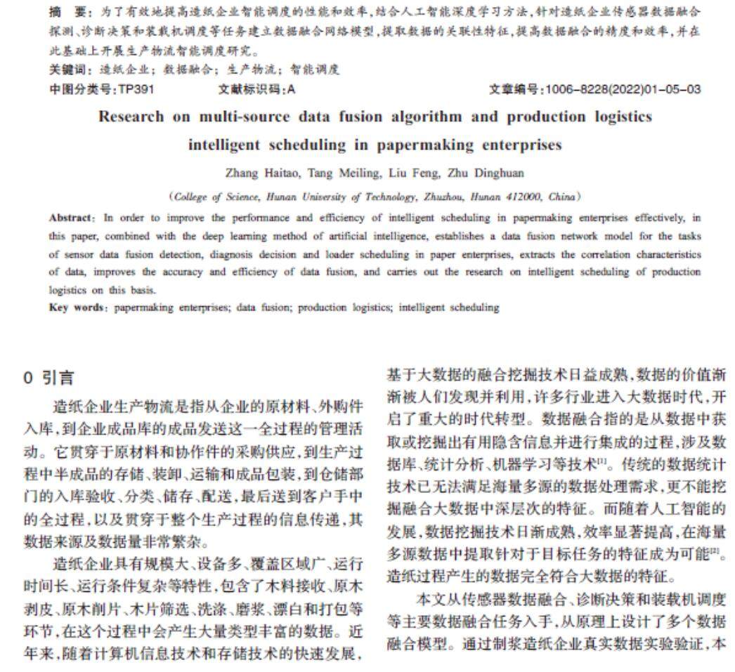 Key words: papermaking enterprises; data fusion; production logistics; intelligent scheduling