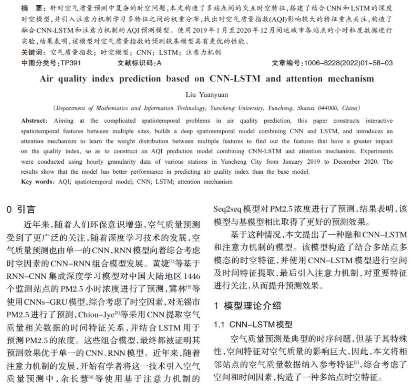摘 要: 针对空气质量预测中复杂的时空问题,本文构造了多站点间的交互时空特征,搭建了结合CNN和LSTM的深度时空模型,并引入注意力机制学习多特征之间的权重分布,找出对空气质量指数(AQI)影响较大的特征重点关注,构造了融合CNN-LSTM和注意力机制的AQI预测模型。使用2019年1月至2020年12月间运城市各站点的小时粒度数据进行实验,结果表明,该模型对空气质量指数的预测较基模型具有更优的性能。(剩余4572字)
