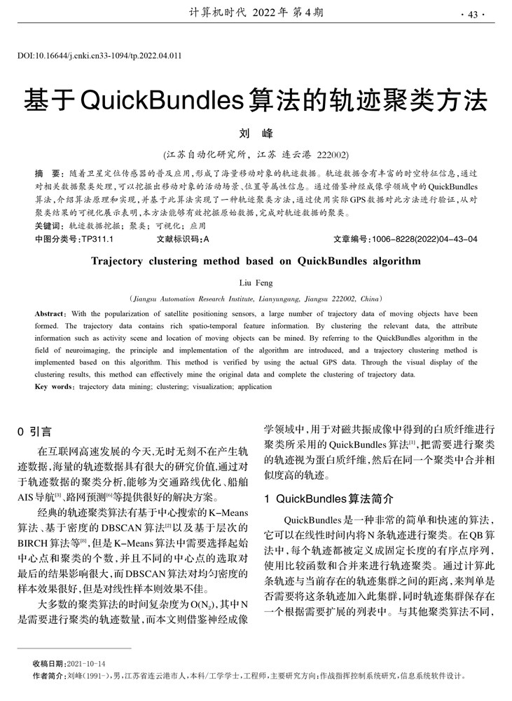 摘 要: 随着卫星定位传感器的普及应用,形成了海量移动对象的轨迹数据。轨迹数据含有丰富的时空特征信息,通过对相关数据聚类处理,可以挖掘出移动对象的活动场景、位置等属性信息。通过借鉴神经成像学领域中的QuickBundles算法,介绍算法原理和实现,并基于此算法实现了一种轨迹聚类方法,通过使用实际GPS数据对此方法进行验证,从对聚类结果的可视化展示表明,本方法能够有效挖掘原始数据,完成对轨迹数据的聚类。(剩余6844字)