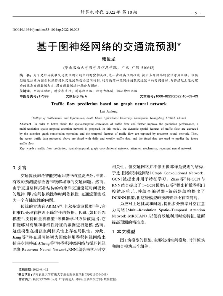 Key words: traffic flow prediction; spatial-temporal; graph convolutional network; attention mechanism; recurrent neural network