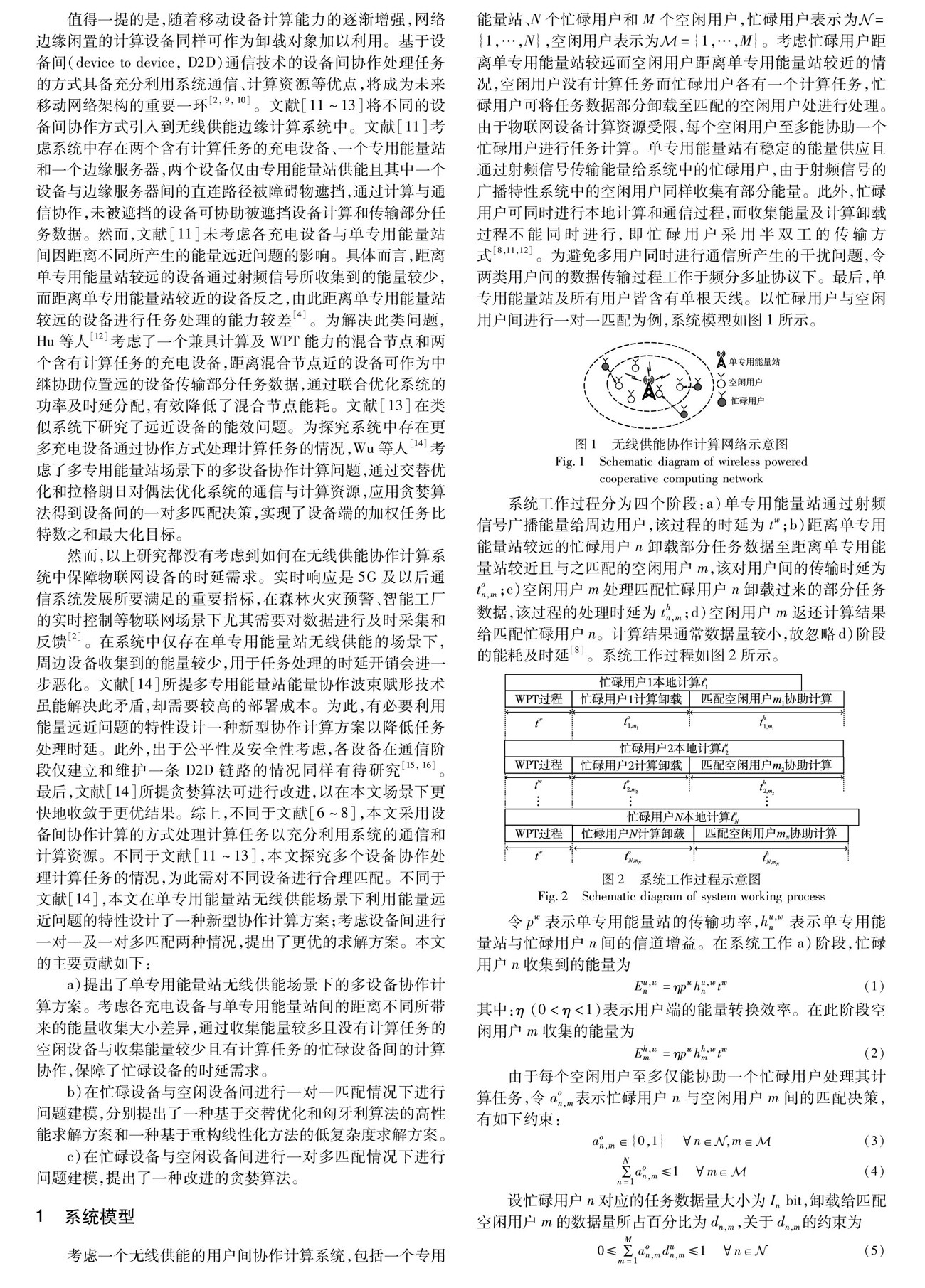 摘 要: 在单专用能量站为多个用户无线供能的场景下,为缩短任务处理时延,设计了一种新型多用户协作计算方案。建立了关于匹配决策和资源分配的优化问题,在用户间一对一匹配情况下提出了一种基于交替优化和匈牙利算法的高性能求解方案和一种基于重构线性化方法的低复杂度求解方案;针对一对多匹配情况提出了一种改进的贪婪算法。(剩余10868字)