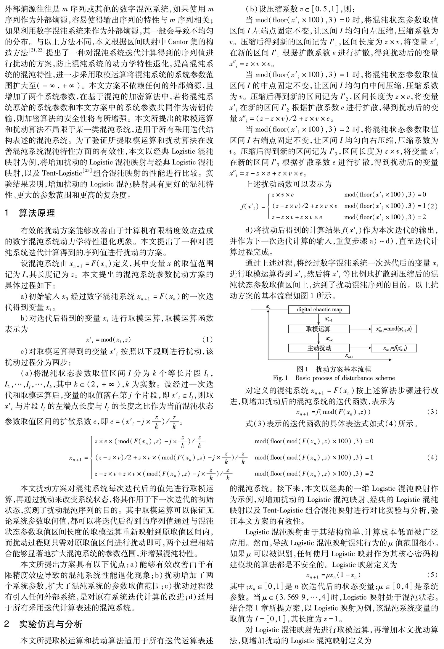 摘 要: 对混沌系统施以扰动可以有效解决由于计算机有限精度效应导致的混沌系统动力学特性退化问题。基于区间映射中Cantor集的构造方法,提出一种数字混沌系统参数扰动方案,该方案将混沌系统每次迭代后得到的序列值等比例地扩散到压缩后的混沌状态参数取值区间上,从而达到扰动混沌序列的目的。实验仿真及分析表明,增加扰动后的混沌系统具有更好的混沌特性、更大的参数范围和更高的复杂度。(剩余15021字)