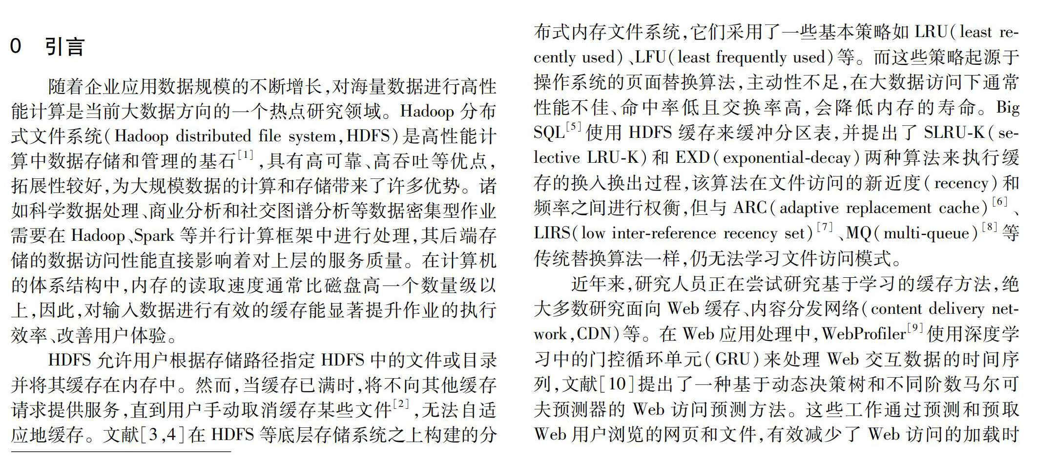 摘 要:传统缓存算法存在命中率低、交换率高等问题,且现有缓存算法在分布式大数据存储系统中并不适用,为此提出了一种基于频繁序列挖掘的自适应缓存策略。该方法使用数据挖掘算法挖掘历史访问窗口内的频繁序列,将频繁序列模糊合并后构建匹配模式集合以供查询。当新的访问来临时,将固定访问长度内的子序列与匹配模式集合进行匹配,然后根据匹配结果预取数据,同时结合修改后的S4LRU(4-segmented least recently used)数据结构进行缓存数据换出。(剩余16364字)